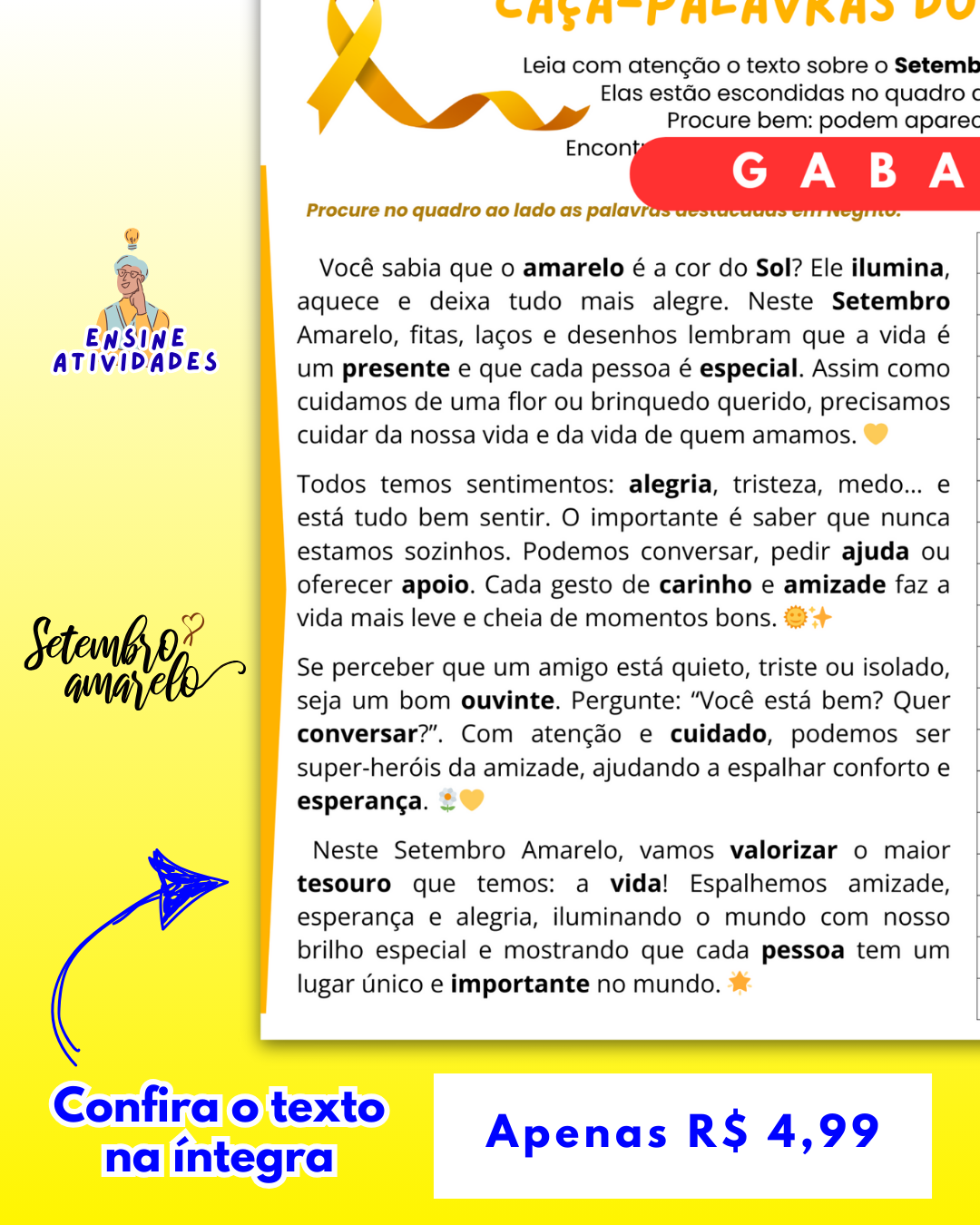 Caça-Palavras Setembro Amarelo, uma atividade pronta para imprimir que trabalha reflexão, acolhimento e esperança.