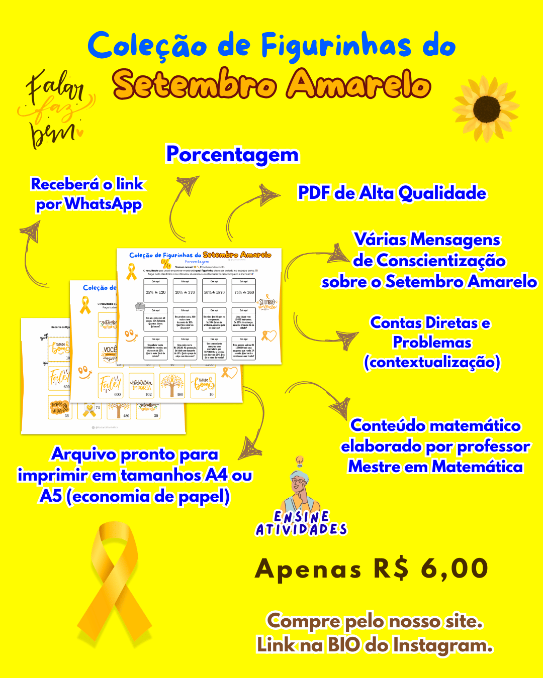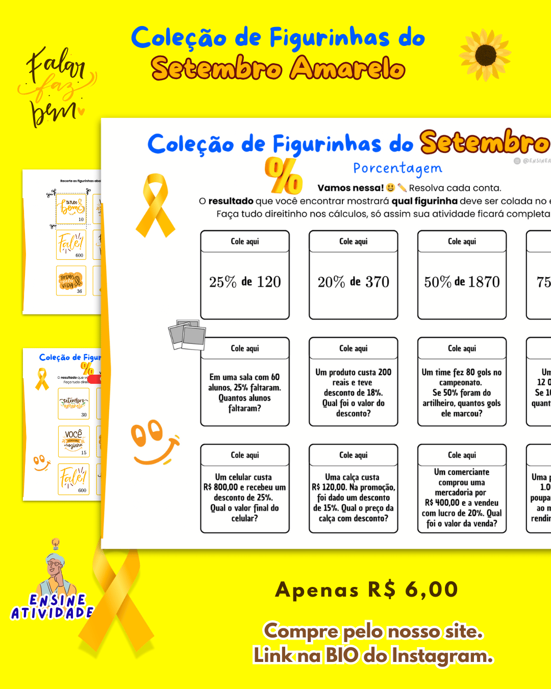 Transforme o aprendizado de porcentagem em uma experiência lúdica e significativa com a Coleção de Figurinhas do Setembro Amarelo.