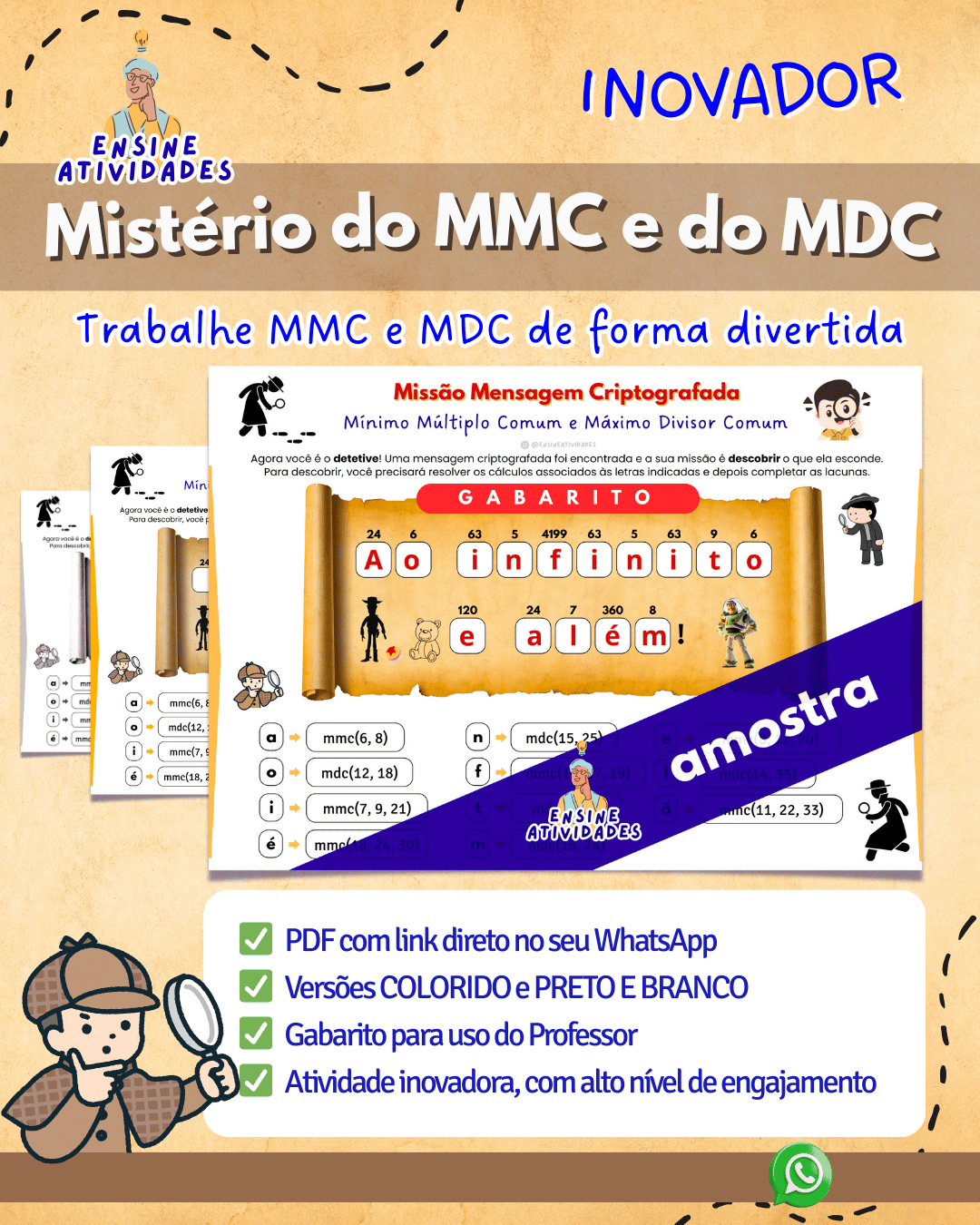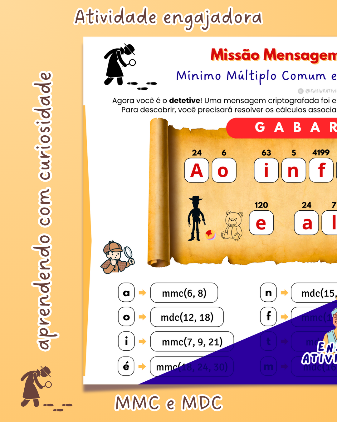 Deixe suas aulas de matemática ainda mais envolventes com esta atividade divertida e pronta para imprimir! Os alunos irão resolver problemas de MMC (Mínimo Múltiplo Comum) e MDC (Máximo Divisor Comum) para descobrir uma mensagem criptografada, tornando o aprendizado de conceitos matemáticos uma verdadeira aventura.